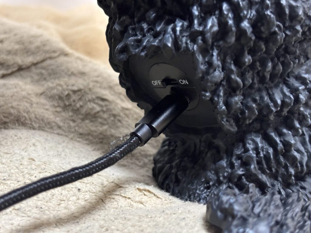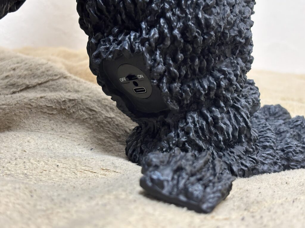 USBケーブル接続部と電源スイッチは、右足のふくらはぎに付いています。