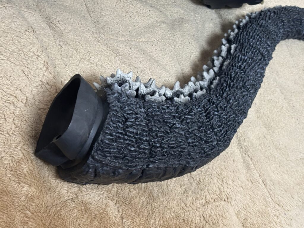多分発光中に内部に手を突っ込ませないための感電対策だと思いますが、空洞となっていたファイナルバトルver.等の過去モデルと違い、本体側の尻尾接続穴が塞がっています。そのため発光ギミックが破損してしまうと、自力での修理困難なのは要注意。