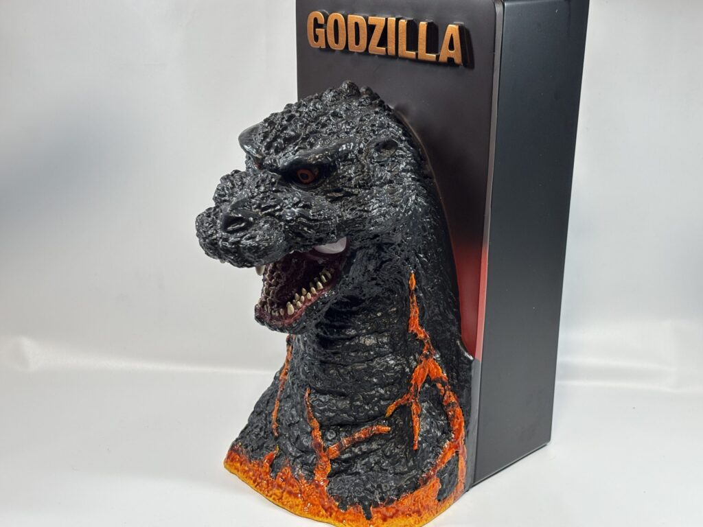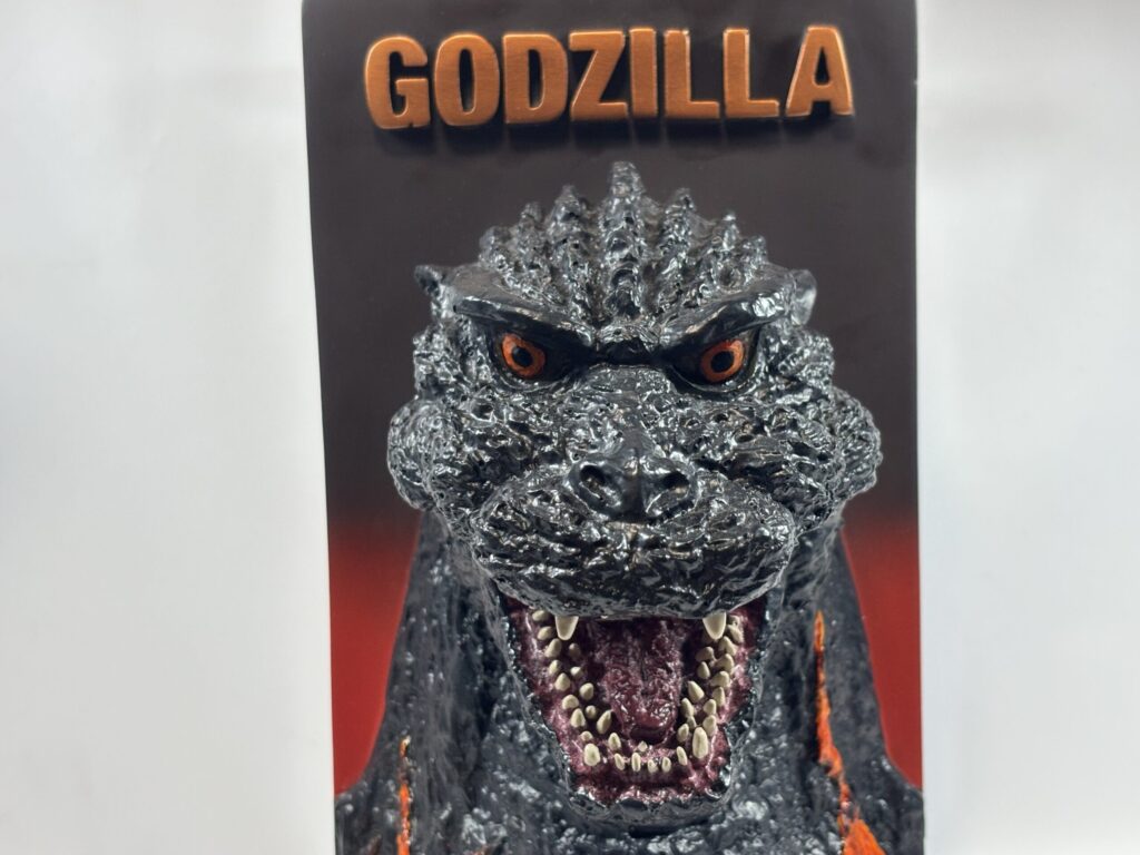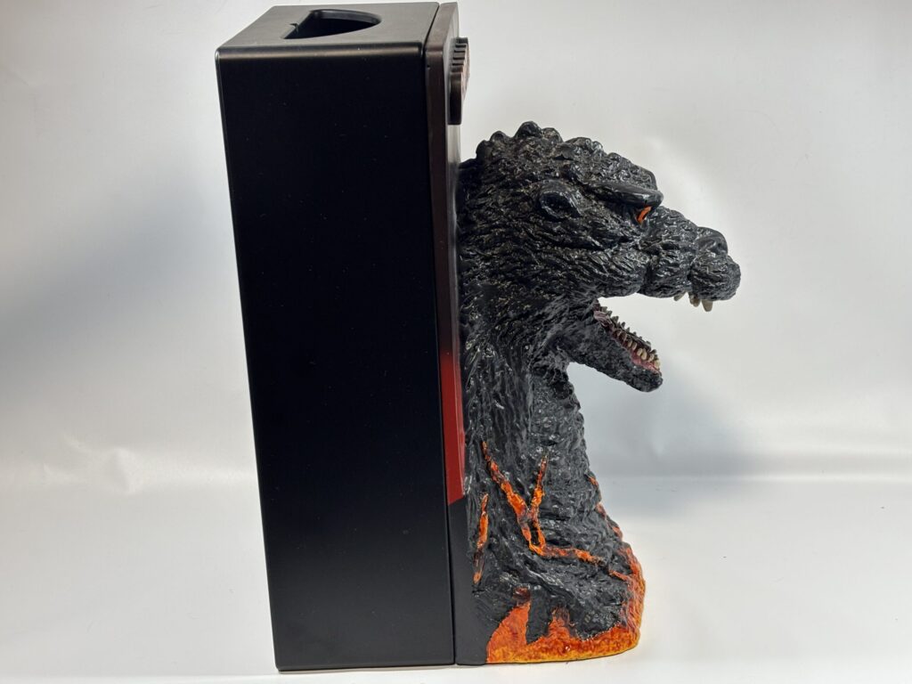 価格は7000円くらいでした。材質はケース部分がプラスチック、ゴジラ部分がポリレジンとなっており、そこそこ重量感があります。持ち帰る時、買い物袋が地味に重かったです。