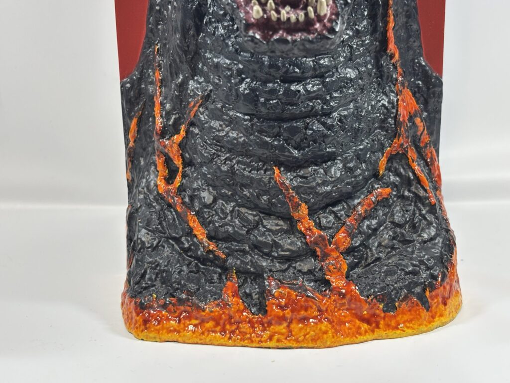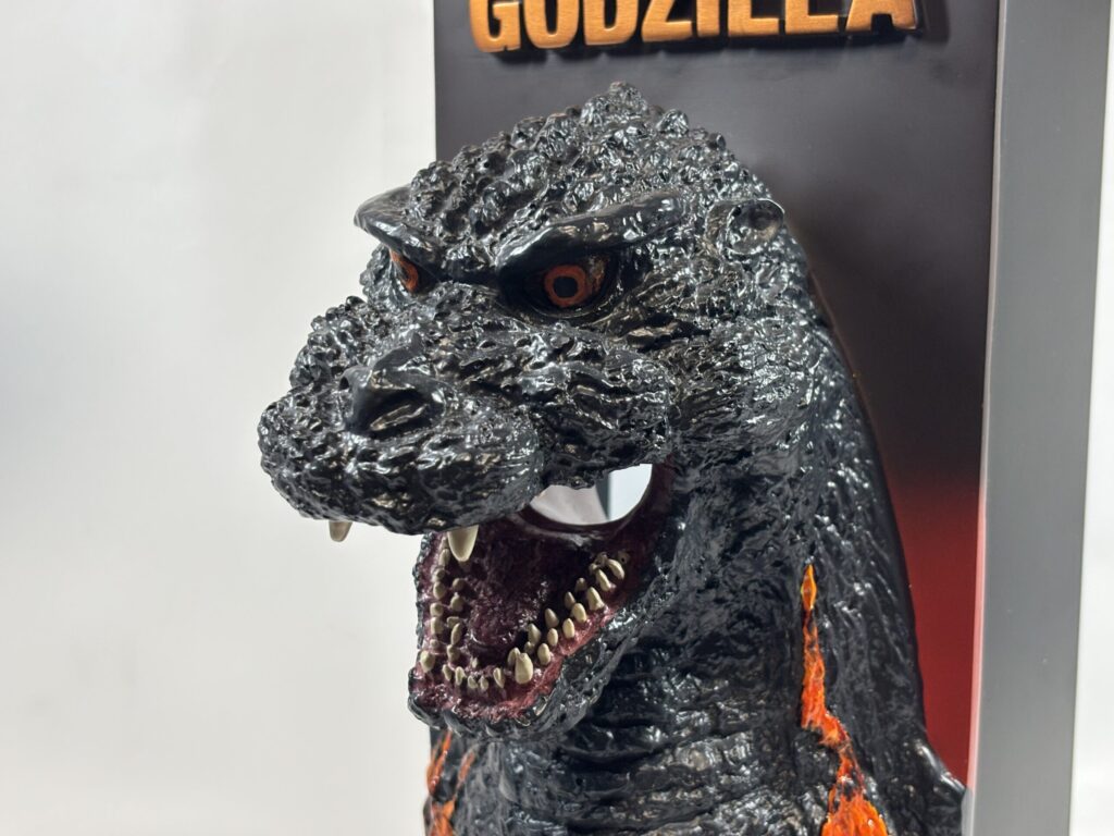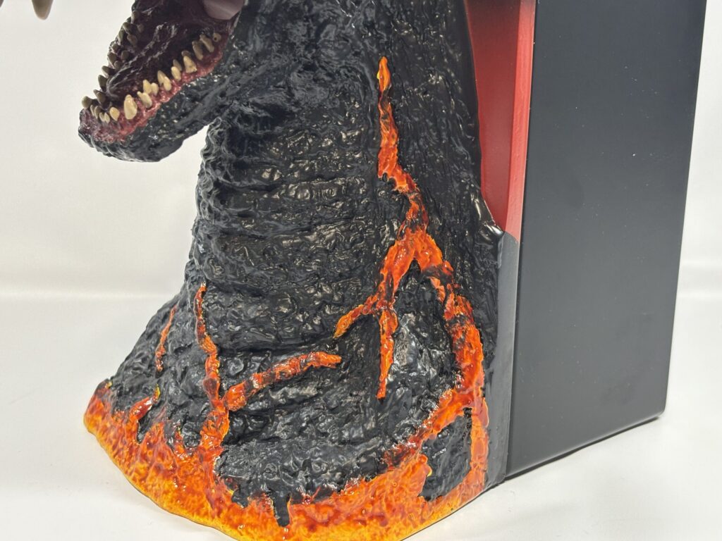 見るからにネタ商品といった感じですが、そこまで高額でない価格の割に造形は悪くないと思います。平成ゴジラの特徴的な2列の牙もちゃんと再現されています。塗装は恐らく筆による豪快なベタ塗りで、エアブラシを吹いたような繊細な彩色にはなっていません。(それでも一番くじの香港上陸よりはだいぶマシに見えます。)
