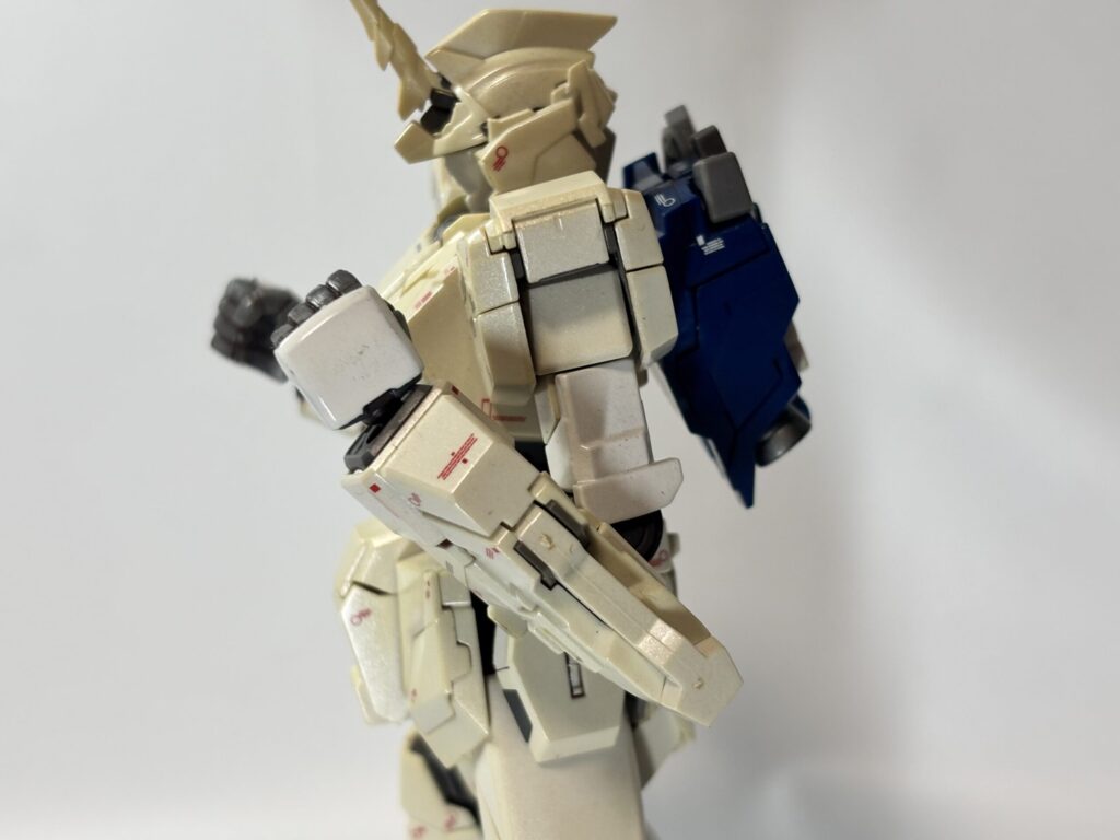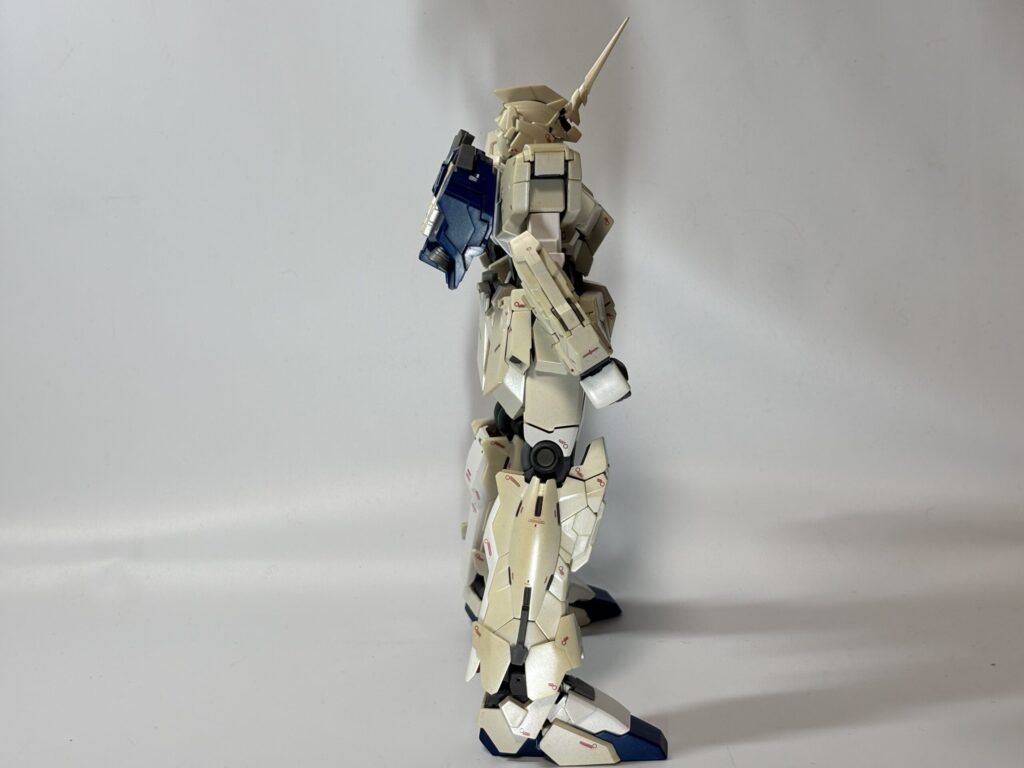このユニコーンガンダムは、成形色の上から全身パールコーティングされているので皮膜代わりになるものと思っていましたが、そんなことはありませんでした。どうやらABSパーツは紫外線などの影響で皮膜の下からでも変色するするようで、透明なパールコーティングだけの仕上げでは変色したABSが透けて見えてしまうそうです。