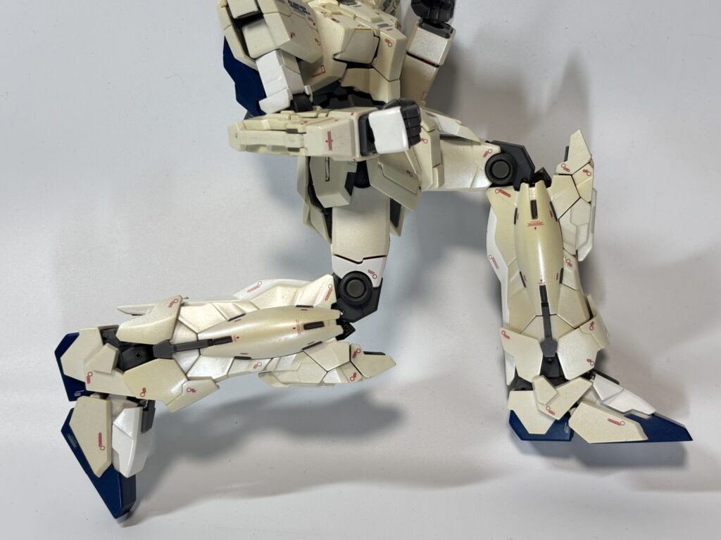 真面目に評価すると、各部位の可動はかなり悪いです。膝が90度くらいしか曲がらず、足首が柔軟に動かないので設置性も悪いです。MGや初期ROBOT魂もそうだったので、当時はユニコーンガンダムは設計上こういうものと割り切っていましたが、リメイク版ROBOT魂のフルアクションバージョンが出てから大幅に改善された記憶があります。