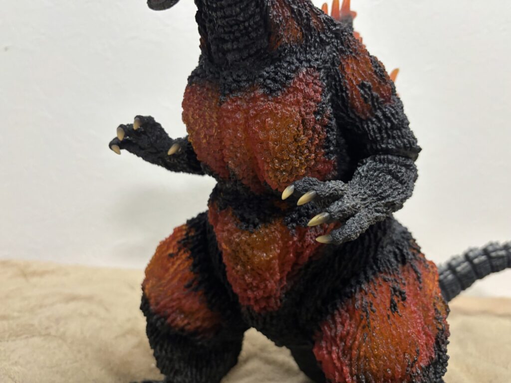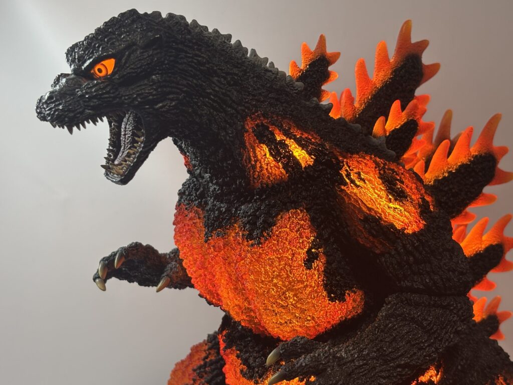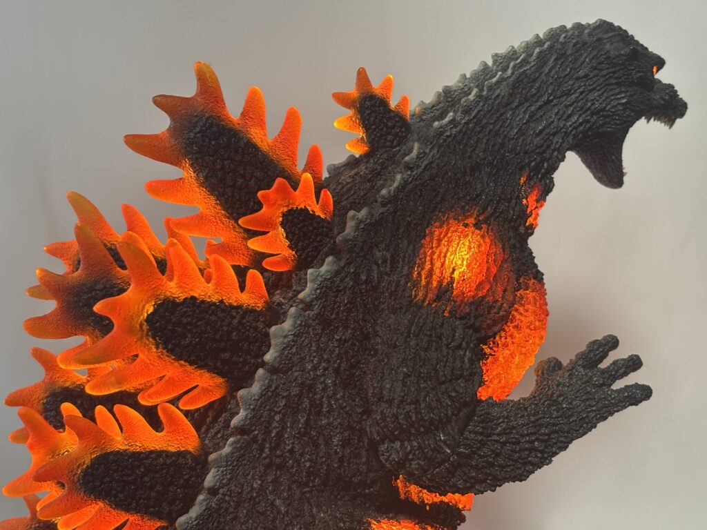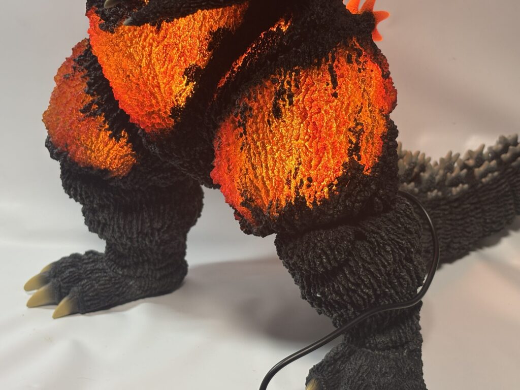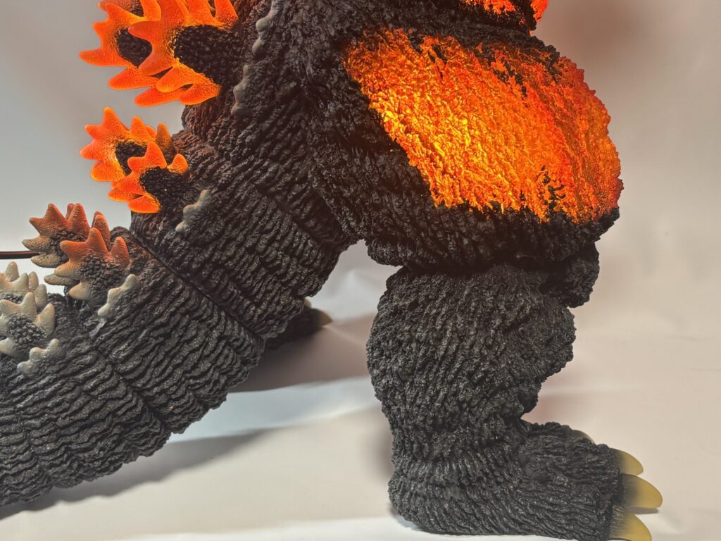 造形は素晴らしいものの、発光しなければ赤熱部の色がかなり地味。ポリストーンなので無理だったのかもしれませんが、ギガンティック版のように背面のシルバー塗装もして欲しかったです。