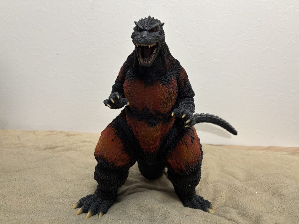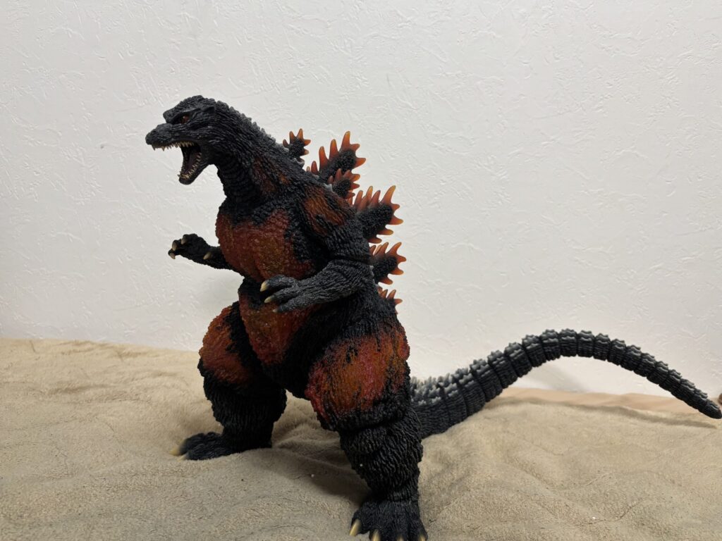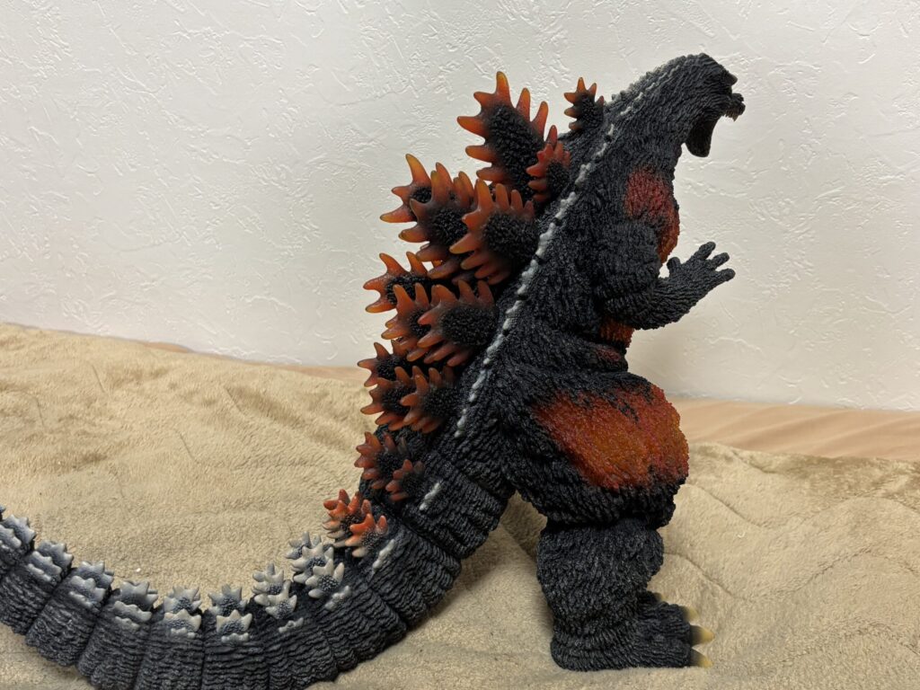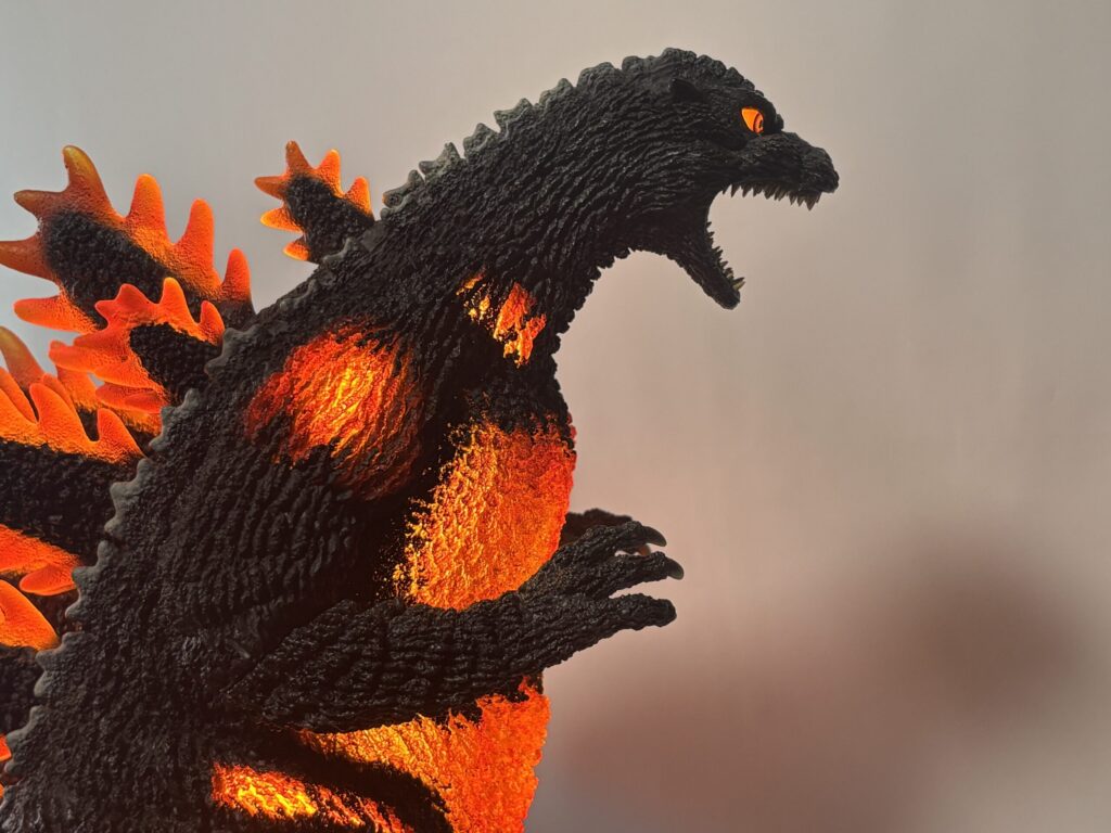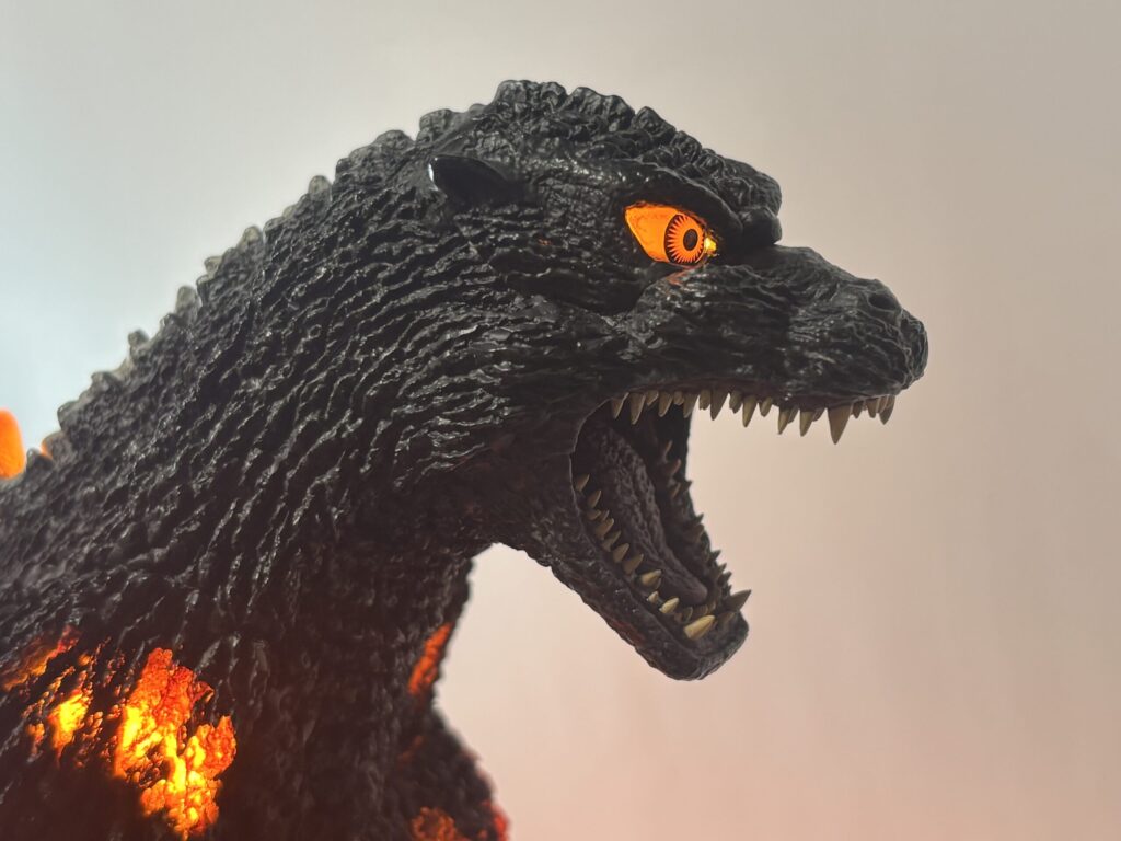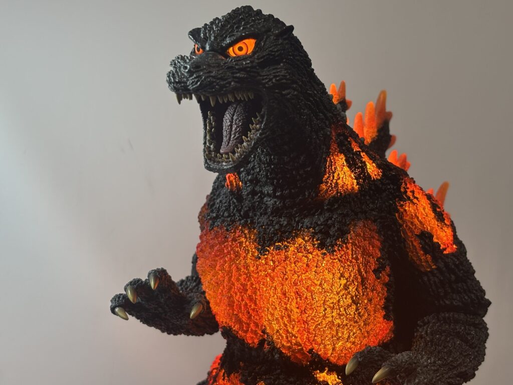 造形は素晴らしいものの、発光しなければ赤熱部の色がかなり地味。ポリストーンなので無理だったのかもしれませんが、ギガンティック版のように背面のシルバー塗装もして欲しかったです。