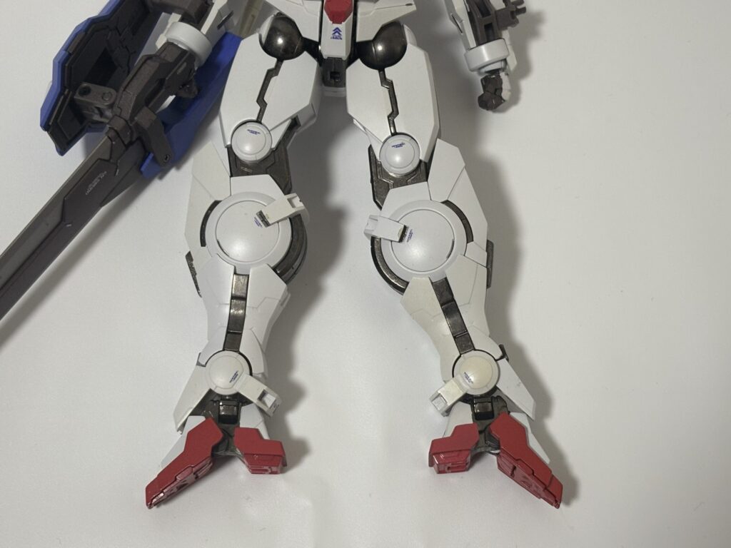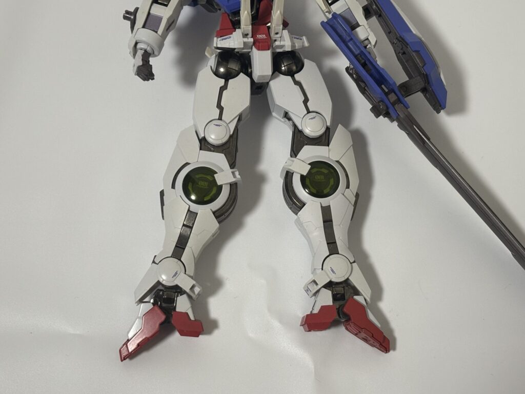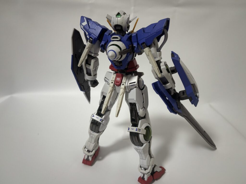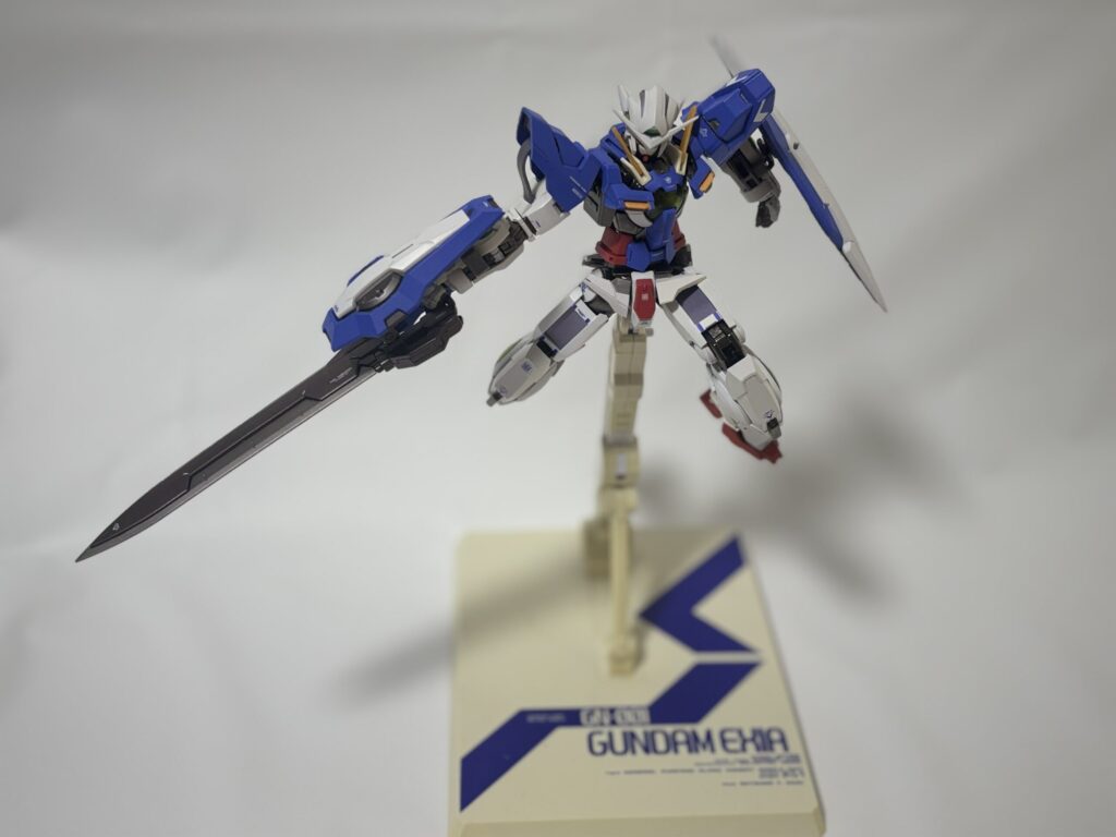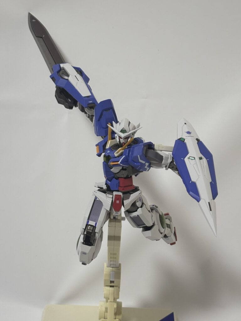 可動に関しては、足回りは問題ないものの、上半身がかなりクッタクタ。右腕は特に酷く、GNソードが重さに負けて高い位置でキープできません。あと接続軸がやたら短いせいで右腕がすっぽ抜けやすいです。(写真では剣先を壁に当てて支えています。)