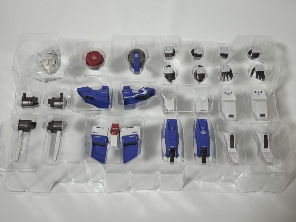 装備のブリスター一式。こちらは特に変色はありませんでした。GNブレイド2種がヤバそうかと思いましたが、大丈夫でした。GNドライブは、接続部分だけ黄ばんでますが、取り付けてしまえば完全に隠れる場所なのでセーフ。