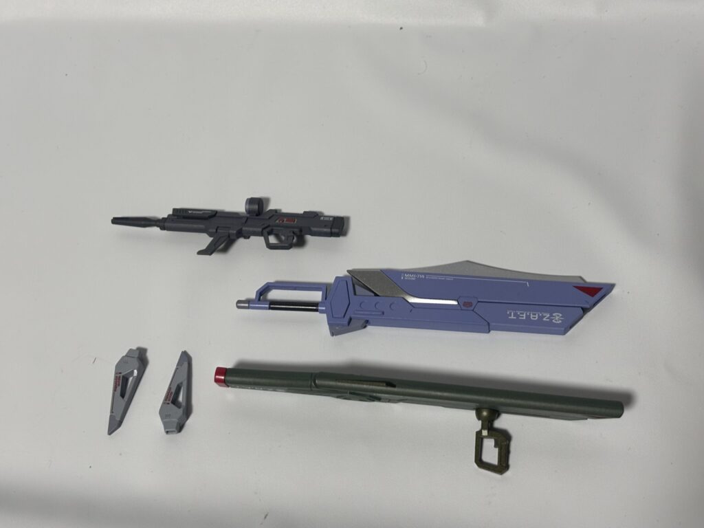 アロンダイトと長距離射程ビーム砲は長さと太さがしっかりしていて、貧弱さを感じない力強い造形です。本体付属のものでも十分なくらいですが、光の翼オプションセットにパースが効いて先が太くなったバージョンのものが付属しています。